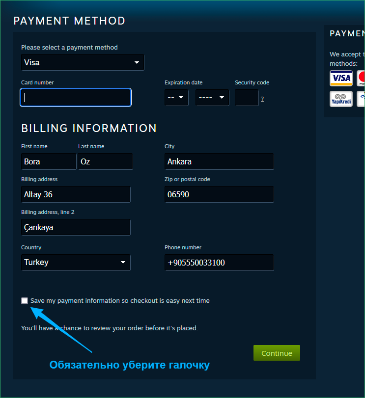 ❗️❗️❗️ Обязательно уберите галочку с "Сохранить платежную информацию"